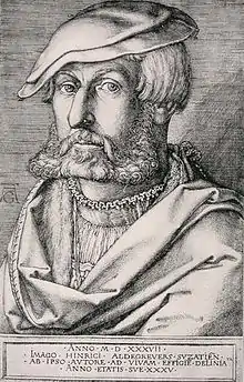 Heinrich Aldegrever or Aldegraf (1502–1555, 1558[1] or 1561) was a German painter and engraver. He was one of the "Little Masters", the group of German artists making small old master prints in the generation after Albrecht Dürer.