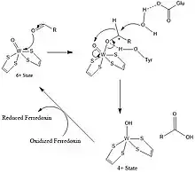 In the catalytic cycle, W(VI) (tungsten "six") converts to W(IV) concomitant with oxidation of the aldehyde to a carboxylic acid (equivalently, a carboxylate).[3] A W(V) intermediate can be detected by EPR spectroscopy.[3][8]
