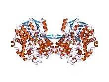 AOR is homodimeric. Each 67kDa subunit contains 1 tungsten and 4-5 Iron atoms.[3] The two subunits are bridged by a low spin Iron center. It is believed that the two subunits function independently.[3]