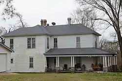 The Alden House is a historic house in a rural part of southern Bentonville, Arkansas. It stands in an agricultural area 0.75 miles (1.21 km) north and 0.4 miles (0.64 km) west of the community of Osage Mills. It is a 1+1⁄2-story wood-frame structure, most notable for a single-story porch, which wraps around three sides of the house. The main entrance is located in the beveled northwest corner of the building. The house, built c. 1900 by the son of Philo Alden, a leading local farmer of the time, has a distinctive combination of Colonial Revival and Eastlake Victorian features.[2]