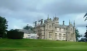 The large building which stands opposite the church, called Aldingham Hall has no connection with the earlier Lords of the Manor. The magnificent building was begun in 1846 by Dr. John Stonard, then rector of the parish, and took four years to build. Stonard never saw it finished, however, as he died in 1849 and left it to his manservant, Edward Jones Schollick, who had reportedly saved his master's life on the sands of Morecambe Bay.[8] Schollick became a local philanthropist with interests in shipbuilding and iron ore mining. He was unpopular, however, and emigrated to Australia in 1876. The hall has since been a convalescence home and is now a home for the elderly.