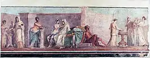 The so-called Aldobrandini Wedding (Nozze Aldobrandini) fresco is an influential Ancient Roman painting, of the second half of the 1st century BC, on display in the Vatican Museum. It depicts a wedding along with several mythological figures.