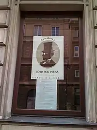 A 1982 plaque on Warsaw University's administration building, the historic Kazimierz Palace, commemorates Prus' years at the University in 1866–68. Across the street (Krakowskie Przedmieście) from the University, in Holy Cross Church, adjacent to the pillar that hold's Chopin's heart, a 1936 plaque by Prus' nephew Stanisław Jackowski, featuring Prus' profile, is dedicated to the memory of the "great writer and teacher of the nation."[98]