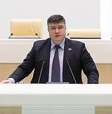 His political career started in 2005 when he was appointed the head of the Central Staff of the All-Russian Public Organization Young Guard of United Russia. From 2009 to 2017, he was a member of the Federation Council,[2][3] and in 2013, he was appointed Deputy Chairman of the committee on social policy.[4] From 2017 to 2021, he headed the Central Executive Committee of the United Russia.[5] Since September 2021, he has served as a deputy of the 8th State Duma.[1]