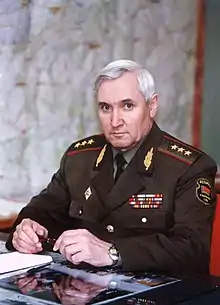 Chumakov entered the Military Academy of the General Staff in July 1978, graduating in 1980. In August of that year he took command of the Belorussian Military District's 120th Guards Motor Rifle Division at Uruchche, leading the division during the Zapad-81 exercises. Chumakov continued to command the division when it was expanded into the 5th Guards Separate Army Corps in June 1982.[5] In June 1986, he was transferred to command the 20th Guards Army of the Group of Soviet Forces in Germany. On 16 February 1988, he was promoted to lieutenant general.[6] Chumakov returned to Belarus in August of that year to become the Belorussian Military District's chief of staff and first deputy commander. In June 1991 he was sent as an advisor to North Korea, and served with the Russian military contingent in Transnistria until July 1995. In December of that year, Chumakov became Chief of the General Staff of the Armed Forces of Belarus and First Deputy Minister of Defence.[2]