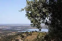 The landscape is primarily one of soft rolling hills and plains, with conspicuous shrubs and the native cork oaks and holly/holm oaks, the established olive trees and grapevines, as well as eucalyptus trees and some native trees. Managed oak landscapes are locally known as montados.[2]