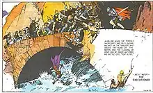 As the Duke of Windsor, Edward VIII called Prince Valiant the "greatest contribution to English literature in the past hundred years".[1] Generally regarded by comics historians as one of the most impressive visual creations ever syndicated, the strip is noted for its realistically rendered panoramas and the intelligent, sometimes humorous, narrative.[2] The format does not employ word balloons. Instead, the story is narrated in captions positioned at the bottom or sides of panels. Events depicted are taken from various time periods, from the late Roman Empire to the High Middle Ages, with a few brief scenes from modern times (commenting on the "manuscript").[3]