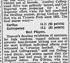 According to The Argus, "Duncan his played many fine games for Carlton, and has also been a tower of strength in interstate teams, but he has never been seen to better advantage. His marking was superb, his judgment faultless, and his kicking splendid, while his dash turned many attacks."[11]