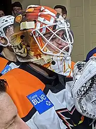 Lyon made his first NHL start February 1, 2018 in a 4–3 loss to the New Jersey Devils.[13] On February 18, 2018, Lyon recorded his first NHL win with the Flyers after replacing an injured Michal Neuvirth in the second period. Lyon saved 25 of 26 shots by the New York Rangers en route to a 7–4 victory.[14]