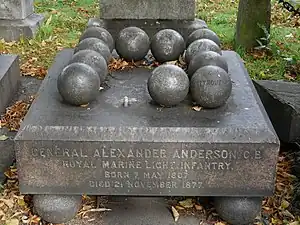 Anderson is buried in Brompton Cemetery in London.[1] His memorial is an unusual composition of cannonballs, one of which has disappeared. Three of the cannonballs are inscribed, individually bearing the words 'Beyrout', 'Gaza' and 'Syria'. The grave lies on the east side of the main path, midway between the north entrance and the colonnades.