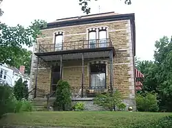 The Alexander Briggs House is a historic house located at 210 Jackson St. in Charleston, Illinois. Prominent local stonemason Alexander Briggs built the stone house in 1894; it is the only stone house remaining in Coles County. The house's design incorporates features of the Italianate and Renaissance Revival styles; the combination is unusual, as the Renaissance Revival style was rarely used in small houses. Briggs built the house with multicolored sandstone and used marble and granite to form decorative belt courses and quoins, giving the house its Renaissance Revival appearance. The house's Italianate elements include its tall, narrow arched windows and its gently sloping roof.[2]