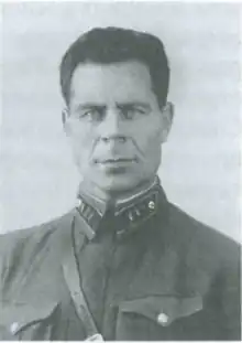 At the beginning of Operation Barbarossa, the German invasion of the Soviet Union, in June 1941, Kostitsyn was transferred to command the 251st NKVD Troops Regiment of the Western Front. He became commander of the 910th Rifle Regiment of the 243rd Rifle Division, formed from NKVD personnel, in August. The regiment and the division became part of the 29th Army of the front and fought in the Battle of Smolensk at the junction of the Western and Northwestern Fronts. He went on to lead the regiment in battles on the Northern Dvina south of Toropets, at Rzhev, and in the Kalinin Defensive and Offensive Operations. Kostitsyn became commander of the army's 183rd Rifle Division on 19 March 1942, defending positions north of Rzhev. He was seriously wounded on 11 May[2] and remained in the hospital until 30 August, before being placed at the disposal of the People's Commissariat of Defense Personnel Directorate.[1] For his leadership of the 910th Regiment in September 1941, Kostitsyn received the Order of the Red Star on 28 August 1942.[3]