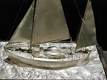 The specially fitted-out 'oceangoing' cruiser Southern Cross left Robertson's Yard on 26 October 1930 and set sail on a 3-year round-the-world trip, arriving at Brisbane in October 1931. On the return leg her owner, the tobacco heir D Guthrie Dunn who was a member of the RCYC, was lost overboard near St Helena. The yacht was brought back to Robertson's Yard by a new crew on 8 July 1933, where she was refitted and sold on. D Guthrie Dunn's cousin Miss E Mathieson donated a silver model of Southern Cross to the Ayr Yacht Club around 1965 which was used as a trophy for the famous Ailsa Craig offshore yacht race. This sturdy cruiser is still sailing in the Mediterranean and based near Barcelona.[13]