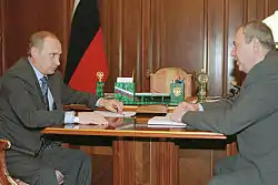In 2001 was appointed as the Minister of the Atomic Energy of the Russian Federation, in the cabinet of the Prime Minister Mikhail Kasyanov. During his tenure the Megatons to Megawatts agreement was renegotiated in 2002.[1][2] Following the dismissal of the whole cabinet in February 2004 by the President Putin, the Ministry was reorganized into a Federal Agency on Atomic Energy where Alexander Rumyantsev was appointed as the CEO.[3] He stepped down from this post in November 2005 during the international scandal[4] involving his predecessor as a Minister, Yevgeny Adamov.