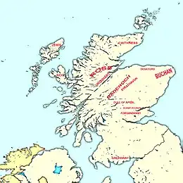 Alexander became the jure uxoris Earl of Ross and this provided him the Ross lands (but only during his own lifetime). Other lands belonging to his wife – including Lewis, Skye, Dingwall and Kingedward in Aberdeenshire – he held in joint ownership with her.[12] His possession of the Barony of Kingedward, a large part of the former Earldom of Buchan allowed King Robert to give Alexander the title of Earl of Buchan only days after his marriage.[13][14] Alexander ruled these territories with the help of his own private cateran forces, building up resentment among other land owners and this included Alexander Bur, Bishop of Moray.[8]