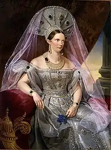 The princess's childhood was marked by the Napoleonic Wars and she was raised under difficult financial conditions.[3] Her father was a kind, religious man but a weak and indecisive ruler who, following military defeats in 1806, lost half of his kingdom. Charlotte's mother, admired for her beauty, intellect, and charm, was considered more decisive than her husband.[1] When the Prussians were defeated at the battle of Jena, Louise fled to Königsberg, taking her children with her, Charlotte then being eight years old. In East Prussia, they were given protection by Tsar Alexander I. "My daughter Charlotte is reserved and concentrated, but like her father, her seemingly cold appearance conceals the beating of her hot compassionate heart", wrote Queen Louise about her daughter.[4] On 27 October 1806, Berlin fell under Napoleon's control and Charlotte grew up in war-torn Memel, Prussia. In December 1809, Queen Louise finally returned to Berlin with her children, but after a few months, became ill and died of typhus at the age of 34, shortly after Charlotte's twelfth birthday.[3] As the eldest daughter, Charlotte was now the most senior lady at the court and had to undertake her mother's duties. For the rest of her life, Charlotte treasured her mother's memory.[5]