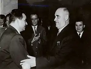 Drăghici was promoted to lieutenant general in 1952 and colonel general in 1955.[12] At the May 1952 party plenum, Drăghici was elected a supplementary member of the politburo (together with Ceaușescu and Dumitru Coliu),[24] sitting as full member from 1955 to July 1965.[12] From 1954, he was assigned to supervise the politburo's own involvement in police work,[25] and drafted a list of "our most dangerous compatriots who have settled abroad", including those of the Romanian National Committee government-in-exile—one of them, Aurel Decei, was later kidnapped by Securitate operatives in West Berlin.[26]
