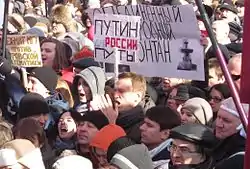 After his release, Navalny informed reporters that it would be senseless for him to run in the presidential elections because the Kremlin would not allow the elections to be fair, but if free elections were held, he would "be ready" to run.[62] On 24 December, he helped lead a demonstration, estimated at 50,000 people, which was much larger than the previous post-election demonstration. Speaking to the crowd, he said, "I see enough people to take the Kremlin right now".[64]