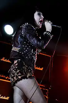 The band's music has been known for its juxtaposition of simple pop hooks with loud, rhythmic noise, electronic beats, harsh guitar riffs and dreamy vocals, which has been described mainly as noise pop.[41][42][43][44][45][46][47] The band's music also has been described as noise rock,[45] indie rock,[47] dance-punk,[48] electropunk,[49] digital hardcore,[50] experimental pop,[41] alternative rock,[51] and industrial rock.[52] While their debut album, Treats, was noted for its punk and heavy metal guitars, glam metal influences and mid-tempo beats from hip hop and electro, their second album, Reign of Terror, was also described as a mixture of "heavy metal shredding with R&B vocals".[53][54][55]