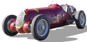 Eight 3.8-litre versions, sharing no castings with the earlier blocks, were individually built for racing in five months, most being used in the Alfa Romeo Monoposto 8C 35 Type C, as raced by Scuderia Ferrari. (The P3 designation was dropped.) The 3.8 produced 330 bhp (246 kW) at 5500 rpm, and had 320 lb⋅ft (434 N⋅m) from 900 rpm to 5500 rpm.[10] It had 15.5-inch drum brakes all round, using Pirelli 5.25 or 5.50 x 19 tyres at the front and 7.00 or 7.50 x 19 tyres at the rear. Though not a match for the big Mercedes and Auto Union on the faster circuits, they came into their own on the tighter circuits and races. In 1936 Tipo Cs fitted with the troublesome V12 did not live up to expectations, and the 3.8 continued to be used. From 1933 Scuderia Ferrari had managed the racing, and the Ferrari prancing horse appeared on the flanks of the Bimotore, but Alfa Corse began to become more active, and Vittorio Jano went at the end of the 1937 season.[9] In 1938 four Alfa Romeo Tipo 308 racers were built for the three-litre class using 8C engines.