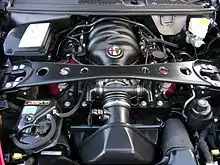 The car uses a unique platform that shares several components with the Maserati GranTurismo.[15][16] The powertrain features a Ferrari/Maserati derived cross-plane,[17] wet sump lubricated 4.7 L (4,691 cc) 90° V8 engine assembled by Ferrari.[3] The top engine performance figures may be summarized as a maximum power output of 331 kW (450 PS; 444 hp) at 7,000 rpm and a peak torque of 480 N⋅m (354 lb⋅ft) at 4,750 rpm (80% at 2,500 rpm) with an engine redline of 7,500 rpm and rev limiter of 7,600 rpm.[18] The V8 engine has variable timing, intake valves and a compression ratio of 11.3:1.[19]