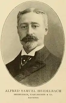 His father, Max Heidelbach, died in 1875, and in 1876, Alfred joined his uncle Philip Heidelbach at the firm of Heidelbach, Ickelheimer & Co. which had been established after the marriage of Isaac Ickelheimer to Philip Heidelbach's daughter.[1] This firm made a specialty of foreign exchange and specie and were able to secure valuable connections abroad. He was a director of the United States Life Insurance Company. In 1893, the firm admitted Henry R. Ickelheimer, who represented the interest of his father, Isaac, one of the founders of the concern.