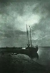Hinton's photograph, "Requiem," was used as the frontispiece of the first issue of Alfred Stieglitz's magazine, Camera Notes, in 1897.[6] His photograph, "Day's Decline," appeared in Volume 3, Issue 1 of Camera Notes two years later. "Reed Harvesting," was exhibited at the first London Salon in 1894, and his "Salt Marshes" was exhibited at the first Paris Salon that same year.[15] Hinton photographs that garnered considerable attention at the Photographic Salon in subsequent years included "Recessional" (1901), "Weeds and Rushes" (1902), "Fleeting and Far" (1903), and "The White Mill" (1907).[15] In a 1907 issue of The Photographic News, Hinton described "Melton Meadows" as his best photograph.[16]