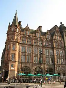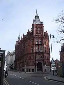 Waterhouse continued to practice in Manchester for 11 years, until moving his practice to London in 1865. At this stage of his career most of his commissions were either in the north-west or north-east of England. His earliest commissions were mainly for domestic buildings. Among Waterhouse's first commissions in 1854 were for his family: a set of stables at Sneyd Park, for his father, who had moved to Bristol, and alterations to the home of his uncle Roger Waterhouse at Mossley Bank in Liverpool.[11] In executing the commission for the cemetery buildings at Warrington Road, Lower Ince (1855–56), he began his move towards designing public buildings in his developing Neo-Gothic style, building a lodge for the registrar, and two chapels, one Church of England in Gothic style, and one for Roman Catholic and Non-conformists in Norman style.[12] His first commission for a commercial building was for the now demolished Binyon & Fryer warehouse and sugar refinery in Chester Street, Manchester (1855). The building was of two floors made of brick with stone dressings and Italianate in style. The intended upper floors based on the Doge's Palace remained unbuilt.[13] Also he designed the Droylesden Institute (1858, demolished) in the Manchester suburb of Droylsden. It contained a reading room and other educational facilities and had some Gothic details. A similar building was the Bingley Mechanics' Institute built (1862–65), located in Bingley, with a hall and reading room in a Gothic style.[14]