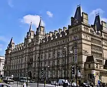 During his period in Manchester Waterhouse's most important commissions were for the Assize Courts and Strangeways prison. The competition to design the new Manchester Assize Courts was launched in 1859. It received 107 entries, by many leading architects including: Edward Middleton Barry; Cuthbert Brodrick; a joint entry by Richard Norman Shaw and William Eden Nesfield; Edward Buckton Lamb; Thomas Worthington; and the runner up Thomas Allom.[20] His success as a designer of public buildings was assured when he won the competition. The building, constructed 1859–65 (now demolished) not only showed his ability to plan a complicated building on a large scale, but also marked him out as a champion of the Gothic cause.[21] The building cost £120,000 (approx £14,500,000 in 2019) to build.[22] The Gothic style of the building was influenced by John Ruskin and his views on Venetian Gothic architecture. Designer John Gregory Crace carried out the elaborate decoration in the Grand Jury Room and the elaborate carving in the central hall was by O'Shea and Whelan. The exterior also had elaborate decoration in contrasting coloured stonework with sculpture and carvings. The foundations were dug by H. Southern & Co.; the building's superstructure was erected by Samuel Bramall; heating and ventilation was the responsibility of G.N. Haden as well as O'Shea and Whelan. Stone carving was also done by Thomas Woolner and Farmer & Brindley; ceramic tiles were provided by Thomas Oakenden; stained glass was by R.B Edmundson, Lavers & Barraud, George Shaw and Heaton, Butler & Bayne; furniture and furnishings were provided by Doveston, Bird & Hull, James Lamb, Kendal & Co., J. Beaumont, Minton & Co. and Marsh & Jones Co.; iron work was by F.A. Skidmore & R. Jones; chimneypieces were by J. Bonehill, W. Wilson and H. Patterson; plaster ceiling roses were by J.W. Hindshaw. The clerk of works were John Shaw, G.O. Roberts and Henry Littler.[23] This building was Waterhouse's first exercise in High Victorian Gothic.