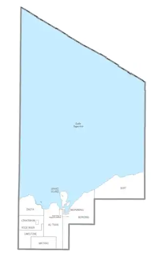 - Alger County contains two very small portions of the Sault Tribe of Chippewa Indians tribal community, which is headquartered in Sault Ste. Marie in Chippewa County. One portion is in the northeastern corner of Au Train Township, and another slightly larger portion is about two miles south of Munising in Munising Township.[11]