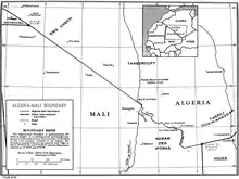 In the meantime the French had been pushing south from the Algerian littoral, conquering much of the Algerian Sahara in 1902.[2][3] A boundary between French West Africa and French Algeria (i.e. Algeria’s modern borders with Mauritania, Mali and Niger) was agreed on 7 June 1905 by the Commandant of Upper Senegal and Niger and the Military Commander of the Department de l'Oasis within French Algeria.[3][2] The border was further defined by the Niamey Convention of June 1909.[2][3]