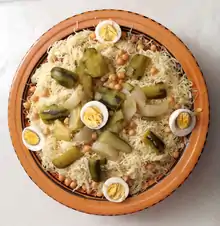 A common and one of the most favorite dishes of Algerian cuisine is couscous.[6] The semolina is traditionally made from wheat but can also be made with barley. The grains can also be fermented to make el Hammoun couscous.[7] The dish can be prepared in many ways, generally with a sauce with beef or lamb and zucchini, carrots, chickpeas and green bean, chicken, lentils and black-eyed pea. Couscous can also be consumed in a masfouf (or thameqfoult in Kabyle), a dry version with no sauce and vegetables such as broad beans, peas or also with raisins and dates, traditionally along with fermented milk.
