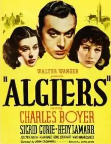 Algiers is a 1938 American drama film directed by John Cromwell and starring Charles Boyer, Sigrid Gurie, and Hedy Lamarr.[2] Written by John Howard Lawson, the film is about a notorious French jewel thief hiding in the labyrinthine native quarter of Algiers known as the Casbah. Feeling imprisoned by his self-imposed exile, he is drawn out of hiding by a beautiful French tourist who reminds him of happier times in Paris. The Walter Wanger production was a remake of the successful 1937 French film Pépé le Moko, which derived its plot from the Henri La Barthe novel of the same name.[3]
