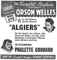 Algiers was adapted for the October 8, 1939, presentation of the CBS Radio series The Campbell Playhouse. The hour-long adaptation starred Orson Welles and Paulette Goddard,[8][9] with Ray Collins taking the role of Inspector Slimane.[7]: 222