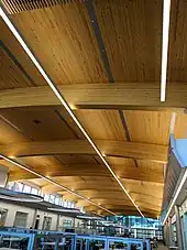 Opened in the fall of 2011, the 180,000-square-foot (17,000 m2) Algonquin Centre for Construction Excellence, designed by Edward J. Cuhaci & Associates Architects in joint venture with Diamond Schmitt Architects, houses 600 additional construction seats and provide space for thousands more students studying in related programs. The uniquely green, Leadership in Energy and Environmental Design (LEED) Platinum certified building showcases a teaching laboratory for best practices in sustainable construction. The new facility integrates the relocated bus station and a new below-grade transit roadway (yet to be completed) to the main campus via a $4 million pedestrian bridge constructed across Woodroffe Avenue.[9]