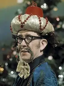 Wallace created his Shriek of Araby character with an oriental costume (robes, golden curly-toed slippers, horn-rimmed spectacles and headgear that incorporated both fez and turban) and took the name Ali Bongo from a character he had created for a youth club pantomime he had co-written and appeared in while in his teens. The original character had sung a song which began: "My name is Ali Bongo and I come from Pongo, pong-tiddley-pongo land."[3] Among his later magic catch-phrases were "Uju Buju Suck Another Juju", "Aldy Bority Phostico Formio", "Hocus Pocus Fishbones Chokus".[5]