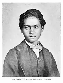 Alfred Russel Wallace travelled to the Malay archipelago in March 1854 along with his collecting assistant Charles Martin Allen (1839–92). During his travels he hired as many as 1200 people at various points of time and in various places. Among them some made an impression on him and were credited in his writings.[1] When they arrived in Singapore on 18 April 1854, Wallace hired a Malay boy named Ali. He described him: