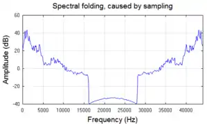 The figures below offer additional depictions of aliasing, due to sampling. A graph of amplitude vs frequency (not time) for a single sinusoid at frequency 0.6 fs and some of its aliases at 0.4 fs, 1.4 fs, and 1.6 fs would look like the 4 black dots in Fig.3. The red lines depict the paths (loci) of the 4 dots if we were to adjust the frequency and amplitude of the sinusoid along the solid red segment (between fs/2 and fs). No matter what function we choose to change the amplitude vs frequency, the graph will exhibit symmetry between 0 and fs. Folding is often observed in practice when viewing the frequency spectrum of real-valued samples, such as Fig.4..