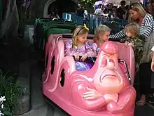 The 1951 feature film proved to lend itself well to the format of a themed dark ride. Just as Alice made her way through a linear series of distinct, largely unrelated episodes in the motion picture, guests in the attraction were shuttled through separate, clearly defined scenes by way of a rail-guided fiberglass ride vehicle. These vehicles, modeled to resemble the film's haughty, hookah-smoking caterpillar, were manufactured by Arrow Development[2] and designed with three wheels instead of the usual four to allow for proper navigation along the ride's sloping track. The iconic "caterpillar cars" have remained in use for the entire duration of the attraction's existence as of 2022. Much in the same vein as Mr. Toad's Wild Ride and Snow White and her Adventures, Alice in Wonderland saw guests navigating boxy corridors illuminated with ultraviolet fluorescents and populated by lavishly painted plywood "flats" representing scenery and characters. One notable trait shared across all of the original Fantasyland dark rides was the deliberate absence of each story's titular character; this was true for Alice in Wonderland as well; Alice herself was nowhere to be found within the ride. Guests were rather made to assume the perspective of Alice themselves, a concept accentuated through the use of brief "storybook-style" narrations delivered by an unseen Alice (portrayed by Katheryn Beaumont, her voice actress from the film) at the beginning of each scene. These narrations might have provided the impression of an older Alice recounting her episodes in Wonderland as guests witnessed them from her point of view.