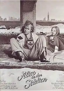 Alice in the Cities (German: Alice in den Städten) is a 1974 German road movie directed by Wim Wenders. It is the first part of Wenders' "Road Movie trilogy", which also includes The Wrong Move (1975) and Kings of the Road (1976). The film is shot in black and white by Robby Müller with several long scenes without dialogue. The film's theme foreshadows Wenders' later film Paris, Texas.[1]