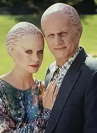 After the generic alien concept was finalized, each of the effects coordinators worked with a specific actor. Mahan chose to work with Mandy Patinkin, as well as Francisco's son. Rosengrant worked with Leslie Bevis who played Cassandra. Woodruff worked on Terence Stamp who played the part of Harcourt.[3] In trying to emphasize the uniqueness of the characters, Mahan commented, "We wanted the audience to be able to recognize the actors immediately. They were all so good, it would have been a shame to cover them up completely."[3] Other effects coordinators like Gillis remarked, "The actor who played Trent Porter, for example–Brian Thompson–was a really rugged guy, so he came off looking like a really tough character. On the other hand, Kevyn Major Howard–who played Harcourt's murderous henchman–had very delicate, boyish kind of features, so we used that quality to create a creepy juxtaposition."[3] While effects coordinators were struggling to finish the final design and full-scale production of the alien prosthetics, Hurd chose makeup artist Zoltan Elek to supervise the overall application.[3] Elek had previously worked on the film Mask and the character Max Headroom.[3] Elek insisted that the alien coloration be much more closer to human skin tones rather than the originally chosen yellowish pigment. Elek recalled his disagreement with Winston as Stan felt, "... the aliens should be a totally different color than the humans, with a lot of yellows, blues and grays. To me, that scheme was too monstrous–in fact, we ended up using it on the Harcourt monster at the climax."[3] Another creative aspect of the makeup was the gradation between the principal and background masks. The crew of Alien Nation sought to avoid the same mistakes made in Planet of the Apes twenty years earlier. As explained by Gillis, "We had what we referred to as 'A-B-C-D' makeups, ... The 'A' makeups were those custom designed for the principal actors, while the 'B' makeups were mix-and-match where we would recombine pieces from other actors to create a new character. Our 'D' masks–the ones furthest from camera–were overhead slip latex masks incapable of changing expression. The 'C' masks, however, were made of foam latex and could be glued down to get some expression from the characters in the middleground."[3] Application of the Newcomer makeup known as "spuds" or "potatoheads" on set, required four hours; a task which Patinkin described as being "a pain in the ass."[5] Masks were manufactured in a production line to meet the enormous demand for the film. Mahan mused, "We would pull the pieces out of the oven, fix them up, paint them and have them ready for pickup that afternoon to be taken to the set. The pieces were barely cold when Zoltan and his crew applied them."[3]