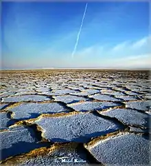 In Arabic, a salt flat is called a sabkha (also spelled sabkhah, subkha or sebkha) or shott (chott). In Central Asia, a similar "cracked mud" salt flat is known as a takyr. In Iran salt flats are called kavir.