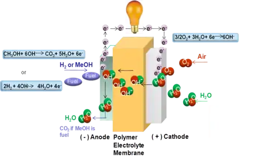 In an AAEMFC, the fuel, hydrogen or methanol, is supplied at the anode and oxygen through air, and water are supplied at cathode. Fuel is oxidized at anode and oxygen is reduced at cathode. At cathode, oxygen reduction produces hydroxides ions (OH) that migrate through the electrolyte towards the anode. At anode, hydroxide ions react with the fuel to produce water and electrons. Electrons go through the circuit producing current.[1]