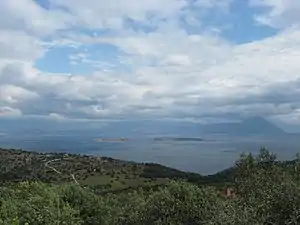 The Alkyonides Gulf (Greek: Κόλπος Αλκυονίδων - Kolpos Alkyonidon) is a bay that connects with the Gulf of Corinth to the west.[1] The bay is approximately 20 to 25 km long and 20 km wide. It stretches from Aigosthena to Cape Trachilos from east to west and from Cape Trachilos to the peninsula of Perachora from north to south. Three regional units surround the gulf: Corinthia to the south, West Attica to the east and Boeotia to the north. Except for the Megaris Plain to the southeast, mountains surround the gulf. These mountains include the Geraneia to the south, Pateras to the east, Cithaeron to the northeast and Mount Helicon to the north. Beaches include Mikra Strava, Strava, Mavrolimni, Kato Alepochori, Aigosthena, Alyki and Paralia Korinis. The Alkyonides Islands, which are also known as Kala Nisia (literal translation: "Nice Islands"), lie in the western end. These islands include Daskalio, Prasonisi and Zoodochos Pigi. More islands, including Fonias and Makronisos lie to the extreme north. Kouveli, in the Domvrenas Bay, also lies in the north.