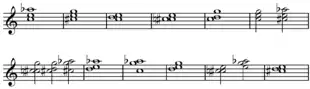 In music, the all-trichord hexachord is a unique hexachord that contains all twelve trichords, or from which all twelve possible trichords may be derived.[2] The prime form of this set class is {012478}[1] and its Forte number is 6-Z17. Its complement is 6-Z43 and they share the interval vector of <3,2,2,3,3,2>.