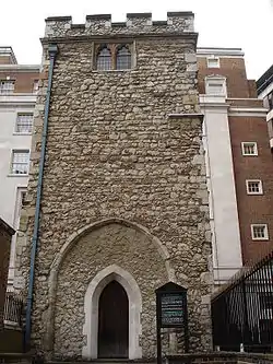 The remains of 'Lambe's Chapel Crypt', lies under the adjacent yard. It was moved from the site of Lambe's Chapel in Monkswell Street and rebuilt here in the mid–12th century. It was said to have formed part of the 'Hermitage of St James on the Wall'. These remains were designated Grade II at the same time as the main tower.[11] William Lambe became a master of the Clothworkers.
