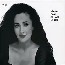 All I Ask of You is the first greatest hits album by Australian singer Marina Prior. The album was released on 17 April 2006. Prior is considered to be the leading lady of Australian theatre and has received numerous awards, including Green Room Awards, Mo Awards and in 1993, she received the Advance Australia Award for her contribution to the performing arts.[1][2]
