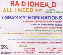 "All I Need" concludes the first half of In Rainbows.[11] On 5 January 2009, TBD Records and ATO Records released "All I Need" to United States adult album alternative radio, marking the fifth and final single from In Rainbows.[18] CD copies of the single were distributed by TBD Records for promotional purposes to coincide with the radio release, which included labels detailing Radiohead's nominations at the 51st Annual Grammy Awards.[19] A performance of "All I Need" was included on the 2008 live video In Rainbows – From the Basement.[20] Yorke remixed "All I Need" as a new song, "Honey Pot", which he played during a guest appearance on the radio station KCRW in June 2013.[21]