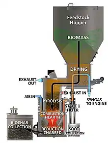 Biomass gasification uses high temperatures in a low-oxygen environment to covert woody feedstocks into a Syngas fuel composed predominantly of flammable hydrogen (H2) and carbon monoxide (CO) gases. When waste biomass is used as the feedstock and the biochar byproduct is sequestered, such as when used as a soil amendment, the operation results in Negative carbon dioxide emission.[15][4][16] APL's gasifiers can use a variety of lignocellulosic biomass (woody biomass) such as wood chips, nut shells, and other agricultural bi-products as feedstock,[4] at the rate of approximately 1 kg/kWh.