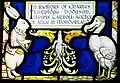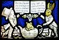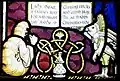 The stained glass in the windows of the south aisle depict the eleven apostles without Judas Iscariot. They were donated in the middle of the 19th century by the Stubbs family, industrialists in Warrington.[5] The east window of the Daniell chapel includes characters from Alice's Adventures in Wonderland. The window was erected following a memorial fund to celebrate the centenary of Carroll's birth in 1935. It was designed by Geoffrey Webb and dedicated on 30 June 1935 by Herbert Gresford Jones, Bishop of Warrington. The upper panels depict a nativity scene surmounted by eight angels, the leftmost panel showing Lewis Carroll himself accompanied by Alice Liddell. The windows incorporate symbolic panels relating to Carroll's life, including the Cheshire wheatsheaf, the arms of Rugby School and Christ Church, Oxford, and mathematical instruments. Across the base of the window are five panels which include characters from the Alice books together with words from Carroll's poem Christmas Greetings. The characters are based on the illustrations by John Tenniel. On the south wall are windows designed by Trena Cox depicting The Flight into Egypt and The Annunciation which were donated to the church in 1960 in memory of the Broome family of Preston-on-the-Hill.[5]